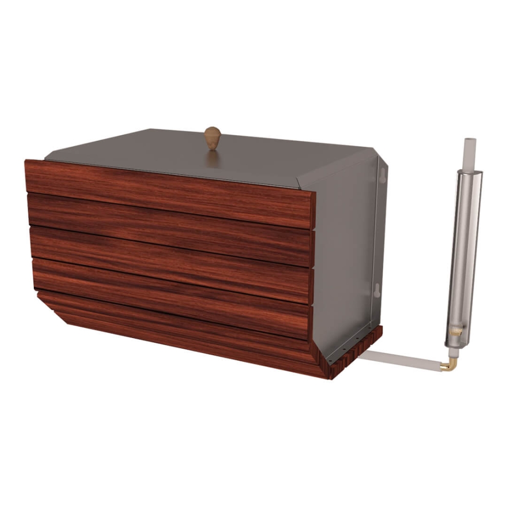 Бак изготавливается из жаропрочной нержавеющей стали AISI 439 толщиной 1 мм и обшивается снаружи декоративными обработанными деревянными планками. Бак имеет съемную крышку и три вваренных в дно ½ дюйма штуцера. Бак навешивается на два ввернутых на размеченном расстоянии самореза.