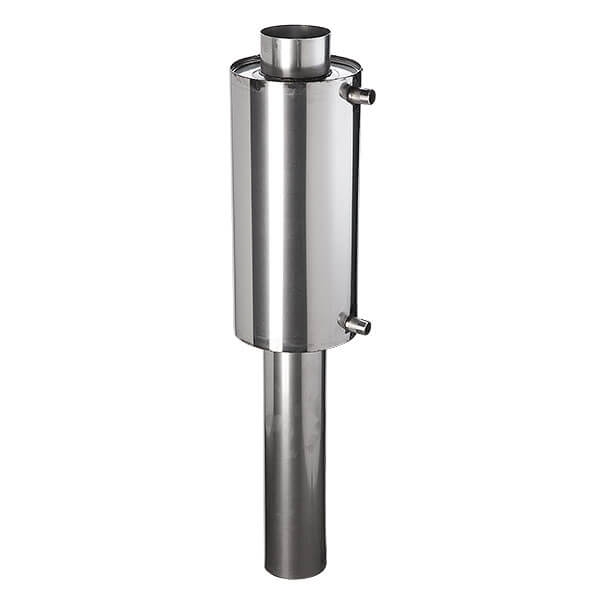 Двадцатилитровый теплообменник из нержавеющей стали AISI-430 и AISI439 1 мм. совместно с накопительным баком, способен разогревать значительное количество воды, до комфортной температуры. Разные диаметры трубы теплообменника позволяют устанавливать его на печи любых производителей.