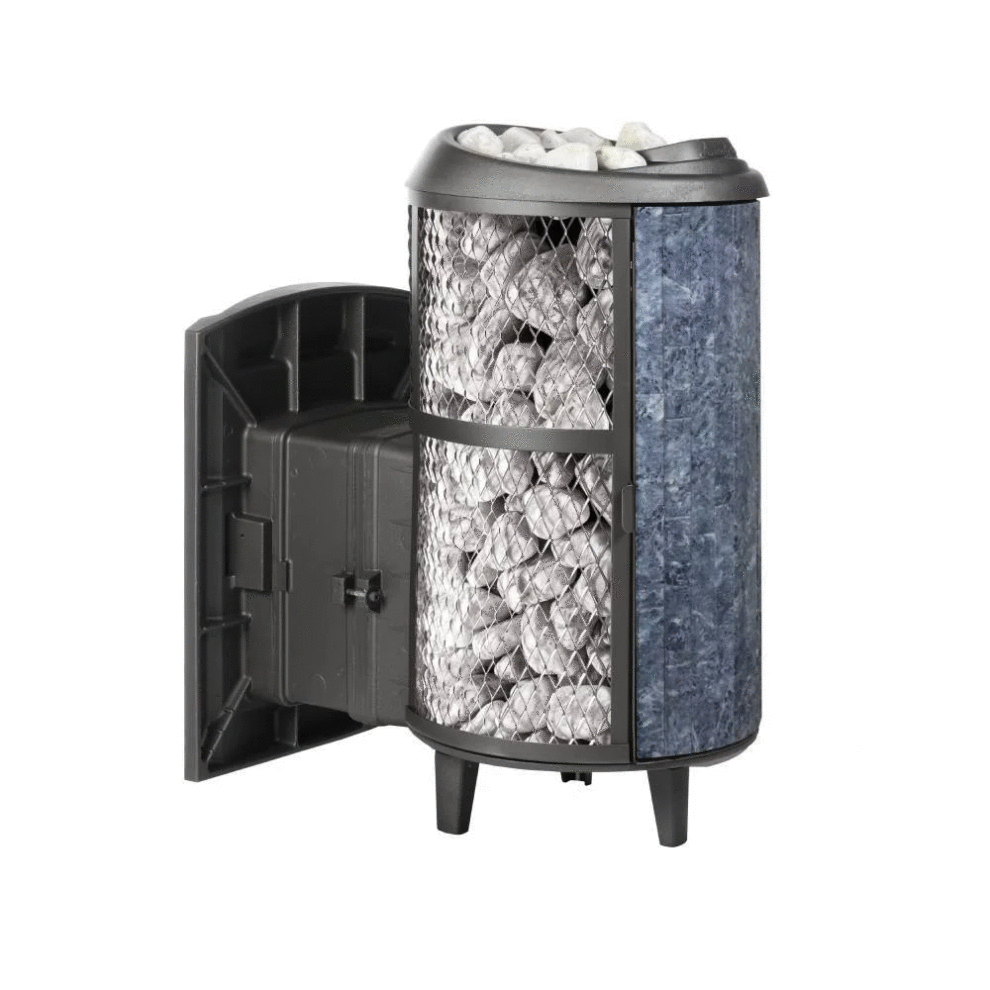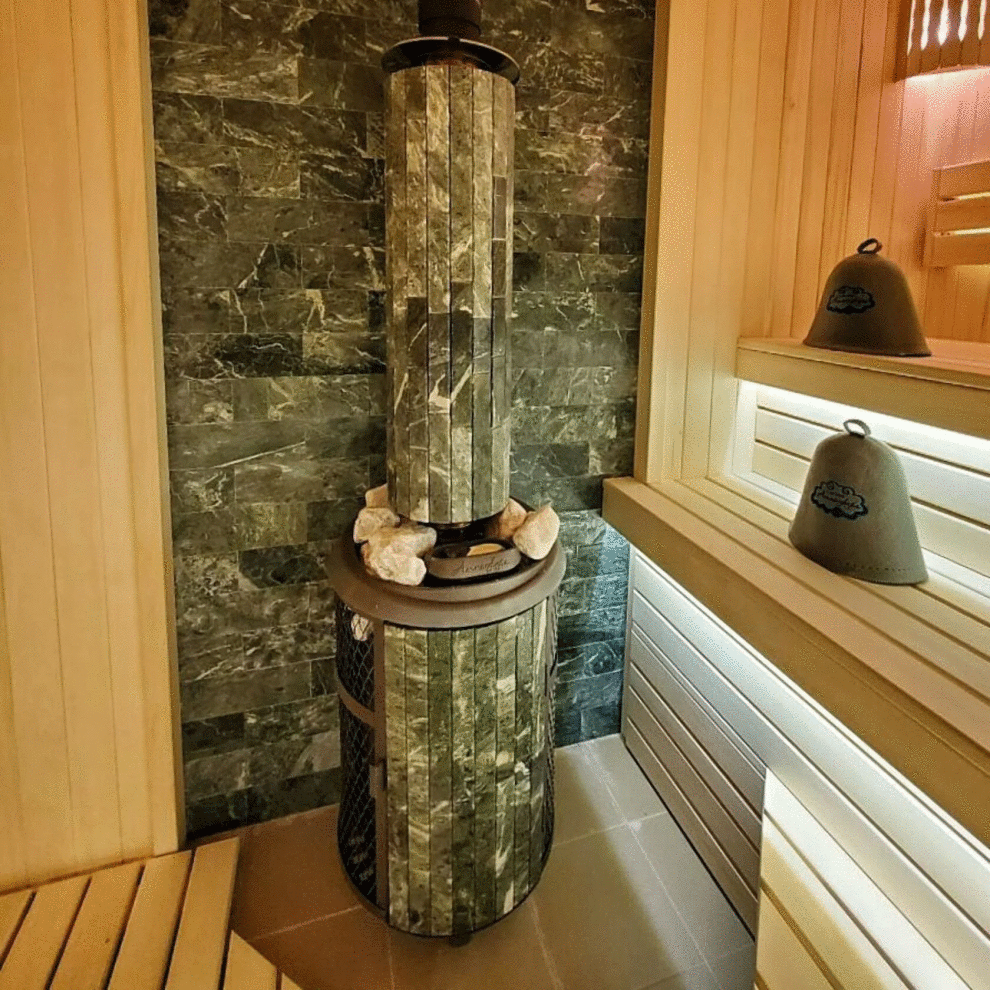 Модель с комбинированной облицовкой из нержавеющей сетки и ламелей. Особенность модели - открывающаяся дверь с ламелями. Это оригинальное решение обеспечивает быстрый прогрев парной.