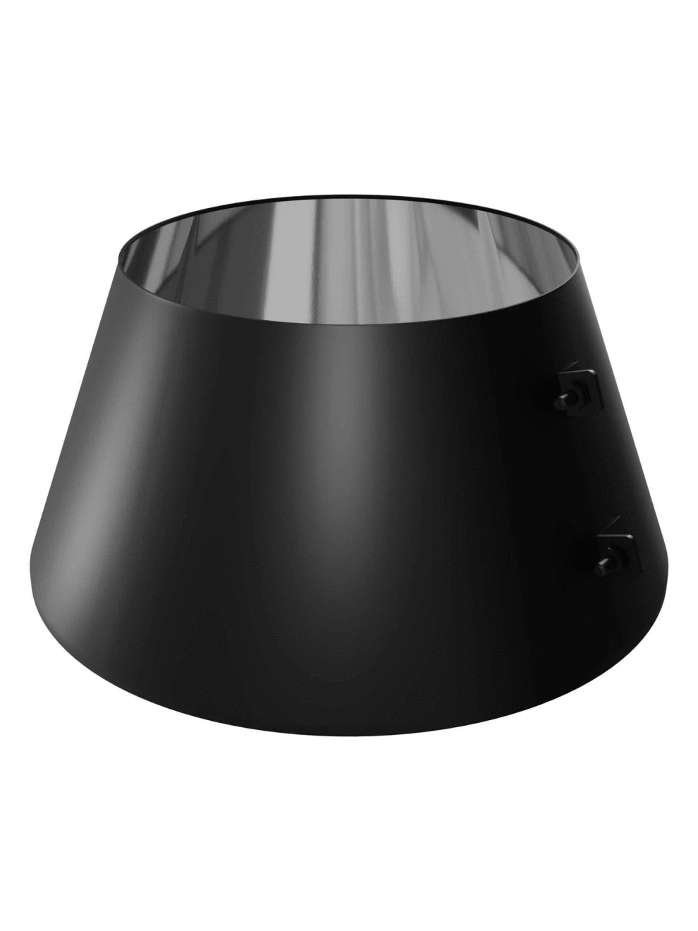 Элемент для предотвращения протечек в подкрышное пространство, используется в местах прохода дымохода сквозь потолочно-проходной узел, или в местах прохода дымохода через стену, как декоративный элемент. Изготовлен из аустенитной стали AISI 304, толщина стенки 0,5 мм. Окрашен в черный матовый цвет термостойкой эмалью