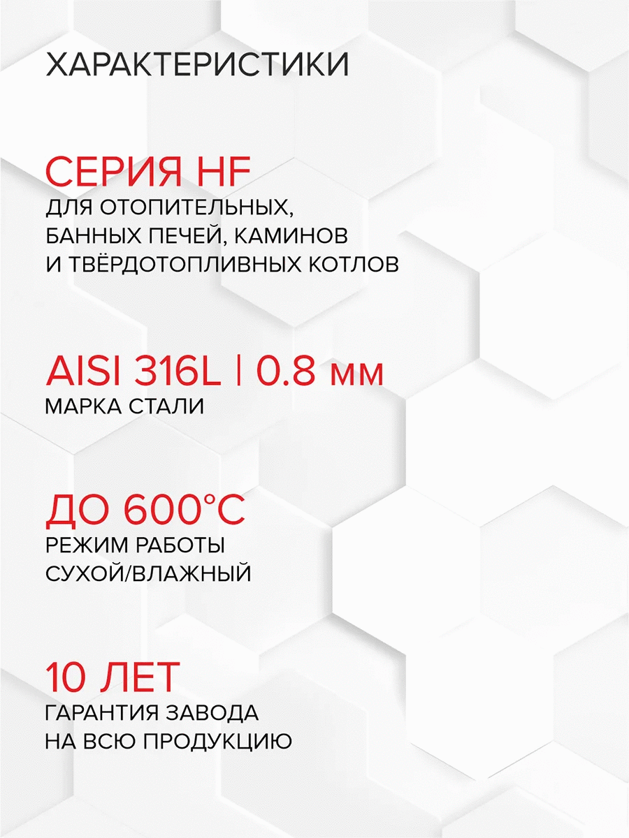 Завершающий элемент дымового канала. Помимо защиты от атмосферных осадков и листвы, препятствует вылету искр из дымоходного канала. Изготовлен из коррозионностойкой нержавеющей стали AISI 316L. Толщина стенки 0,8 мм. Холодная формовка раструбного соединения с идеальной геометрией и газоплотностью. Лазерная сварка встык обеспечивает тонкий и прочный шов, увеличивая в разы срок эксплуатации. Рабочая температура до 600°С.