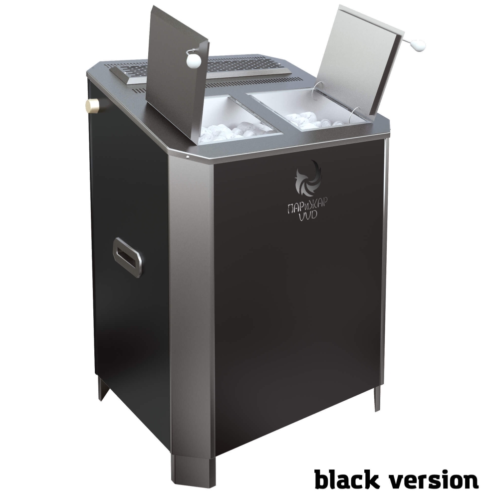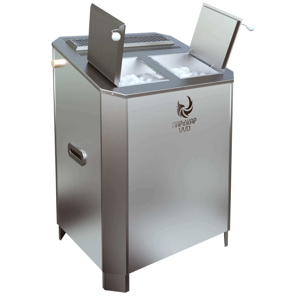 В электрических печах «ПАРиЖАР» получила дальнейшее развитие тема паротермального нагрева парильного помещения, создания в нем комфортного, сбалансированного по температуре и влажности режима. В этих модернизированных моделях электрофицированная схема регулирования уровня воды в баке парогенератора заменена на простую, надежную механическую систему подачи и регулирования уровня воды.Учитывая отзывы и пожелания клиентов, в новых электропечах предусмотрена закрывающаяся дверью (дверями) теплоизолированная емкость для камней, нагрев которой осуществляется автономно, не зависимо от режима работы парогенератора. А сам парогенератор перегретого пара, в зависимости от исполнения и мощности электропечи, может работать в двух или трех режимах по интенсивности парообразования.Конструктивные особенности печей «ПАРиЖАР», а так же специально разработанный для них пульт управления позволили создавать и поддерживать в парильном помещении различные температурно-влажностные режимы:«Сухой нагрев»: нагрев воздуха в парильном помещении осуществляется с помощью ТЭНов каменки. Дверь (двери) каменки открыты. Парогенератор не задействован.«Режим парогенерации»: формирование микроклимата в парильном помещении осуществляется перегретым до 300-330 С паром, генерируемым парогенератором. Парогенератор работает в одном из штатных режимов. ТЭНы каменки либо выключены, либо включены, дверь (двери) каменки закрыта.«Комбинированный режим»: нагрев парильного помещения и создание в нем комфортного микроклимата обеспечивается одновременно работающим парогенератором в избранном режиме и дополнительным нагревом воздуха ТЭНами каменки, через ее открытую дверь (двери).Во всех режимах, при открытой двери (дверях) каменки ТЭНы каменки и парогенератора активируются по сигналу датчика температуры в соответствии с заданной температурой на пульте управления. При закрытой каменке работа ее ТЭНов осуществляется в автоматическом режиме, в зависимости от температуры внутри каменки.Одновременно со значением текущей температуры на пульте управления инициируется также и значение относительной влажности в парильном помещении.Печь изготавливается из нержавеющей стали. Рекомендуется подключать электропечь к центральному водоснабжению, при его отсутствии допускается подключение к выносному баку.