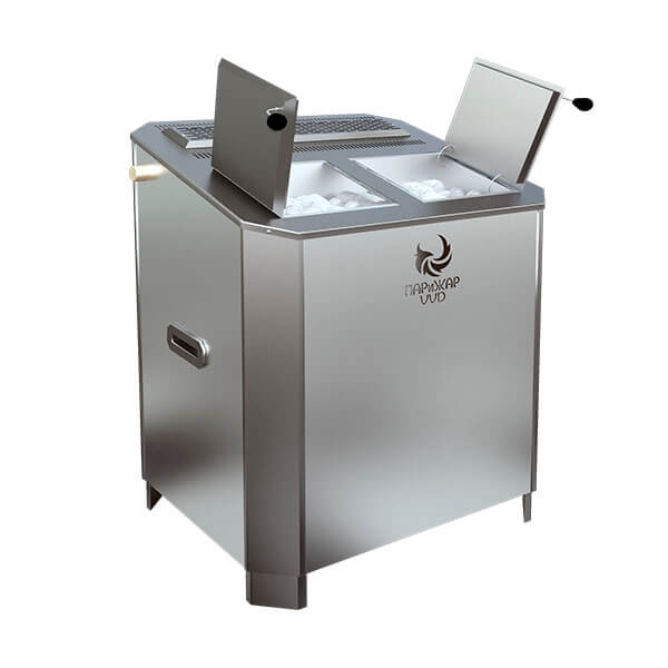 В электрических печах «ПАРиЖАР» получила дальнейшее развитие тема паротермального нагрева парильного помещения, создания в нем комфортного, сбалансированного по температуре и влажности режима. В этих модернизированных моделях электрофицированная схема регулирования уровня воды в баке парогенератора заменена на простую, надежную механическую систему подачи и регулирования уровня воды.Учитывая отзывы и пожелания клиентов, в новых электропечах предусмотрена закрывающаяся дверью (дверями) теплоизолированная емкость для камней, нагрев которой осуществляется автономно, не зависимо от режима работы парогенератора. А сам парогенератор перегретого пара, в зависимости от исполнения и мощности электропечи, может работать в двух или трех режимах по интенсивности парообразования.Конструктивные особенности печей «ПАРиЖАР», а так же специально разработанный для них пульт управления позволили создавать и поддерживать в парильном помещении различные температурно-влажностные режимы:«Сухой нагрев»: нагрев воздуха в парильном помещении осуществляется с помощью ТЭНов каменки. Дверь (двери) каменки открыты. Парогенератор не задействован.«Режим парогенерации»: формирование микроклимата в парильном помещении осуществляется перегретым до 300-330 С паром, генерируемым парогенератором. Парогенератор работает в одном из штатных режимов. ТЭНы каменки либо выключены, либо включены, дверь (двери) каменки закрыта.«Комбинированный режим»: нагрев парильного помещения и создание в нем комфортного микроклимата обеспечивается одновременно работающим парогенератором в избранном режиме и дополнительным нагревом воздуха ТЭНами каменки, через ее открытую дверь (двери).Во всех режимах, при открытой двери (дверях) каменки ТЭНы каменки и парогенератора активируются по сигналу датчика температуры в соответствии с заданной температурой на пульте управления. При закрытой каменке работа ее ТЭНов осуществляется в автоматическом режиме, в зависимости от температуры внутри каменки.Одновременно со значением текущей температуры на пульте управления инициируется также и значение относительной влажности в парильном помещении. Печь изготавливается из нержавеющей стали. Рекомендуется подключать электропечь к центральному водоснабжению, при его отсутствии допускается подключение к выносному баку.