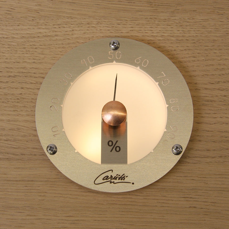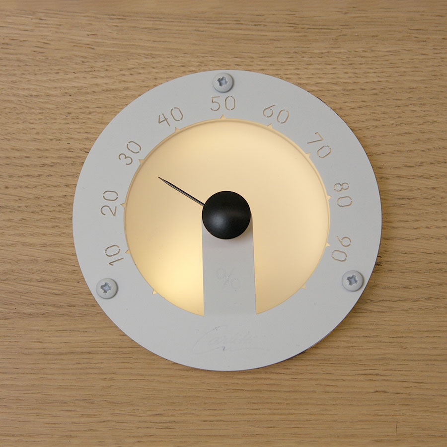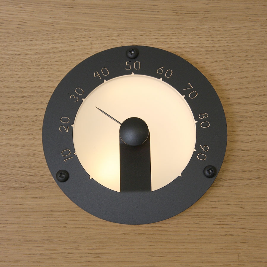 Светильник-гигрометр для сауны. Изготовлен из матового стекла и нержавеющей стали. Подсвечивается одним оптоволокном диаметром 2-4 мм или светодиодным кабелем. Устанавливается при обшивке сауны.