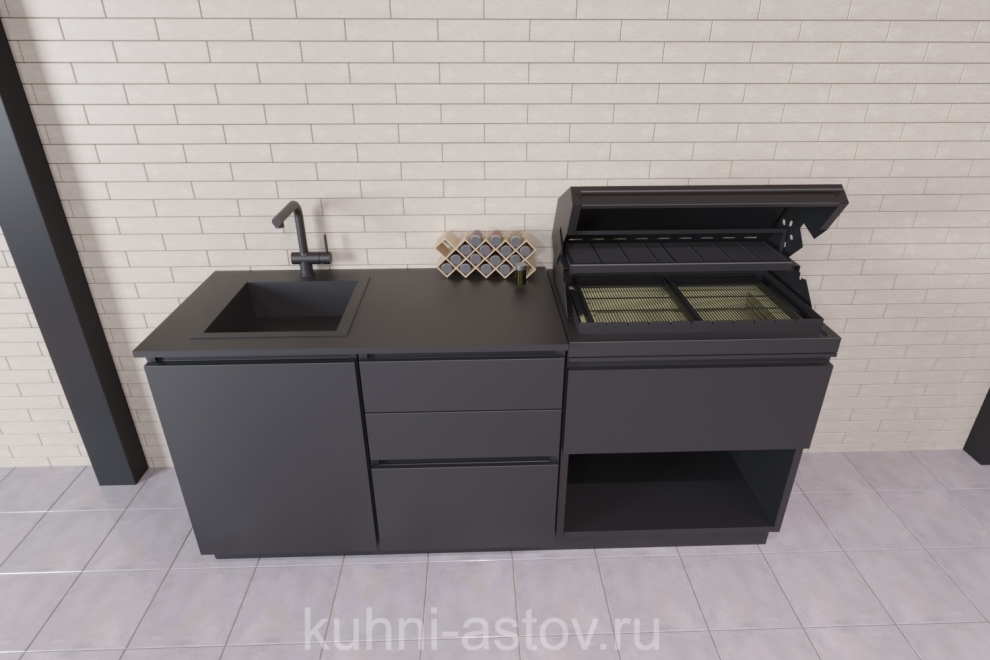 Корпус и фасады выполнены из оцинкованной стали толщиной 1 мм. Фасады двухконтурные с шумоизоляцией. Корпус, фасады, вытяжной зонт покрашен порошковой краской в 2 слоя, цвет: RAL9005. В комплектацию кухни Астов №5 вытяжной зонт не входит. Его можно заказать отдельно. Дополнительно можно установить: — Столешницу. — Мойку и смеситель. Комплект АСТОВ № 55 — это готовая уличная кухня и купить её можно в нашей компании. Она прекрасно подойдёт для создания места для готовки на улице. Если вам нужно, чтобы надёжная конструкция идеально сочеталась с эстетичным внешним видом – присмотритесь к этому готовому решению. Особенности модели: