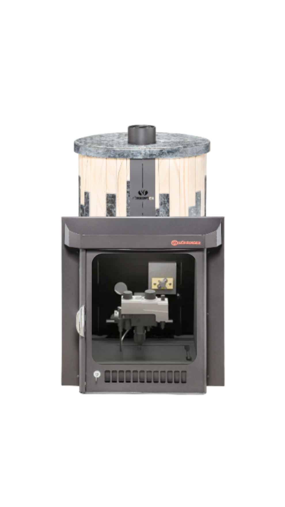 Печь лучше всего работает в комплекте с дымоходом. В Банной системе "Ферингер" за прогрев парной отвечает -