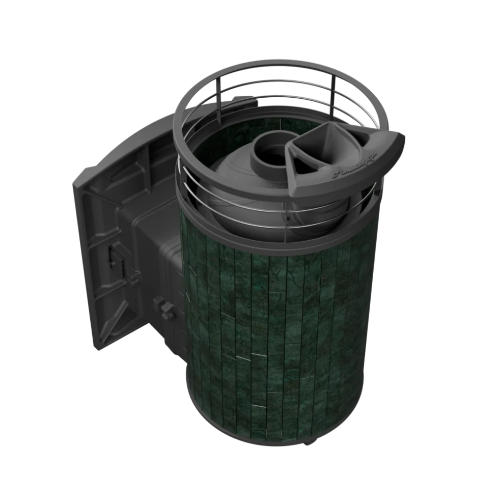 Практичная и компактная модель. Ламели из змеевика по периметру внешней каменки не только обладают хорошими теплонакопительными свойствами, но и придают печи оригинальный внешний вид