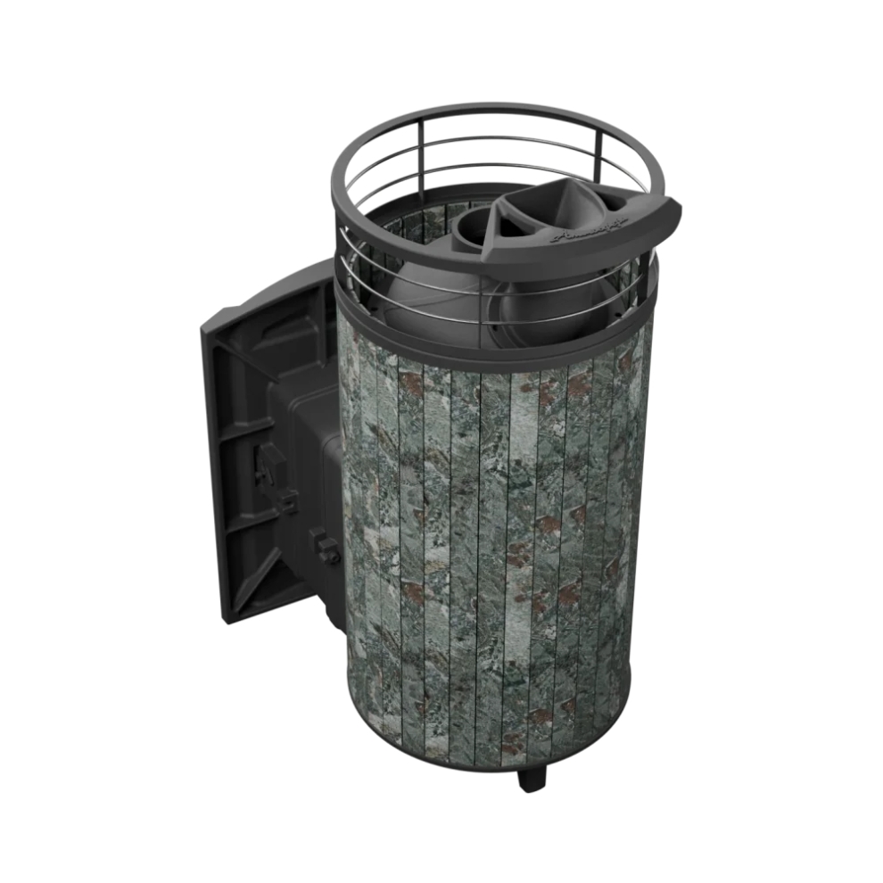 Практичная и компактная модель. Ламели из змеевика по периметру внешней каменки не только обладают хорошими теплонакопительными свойствами, но и придают печи оригинальный внешний вид