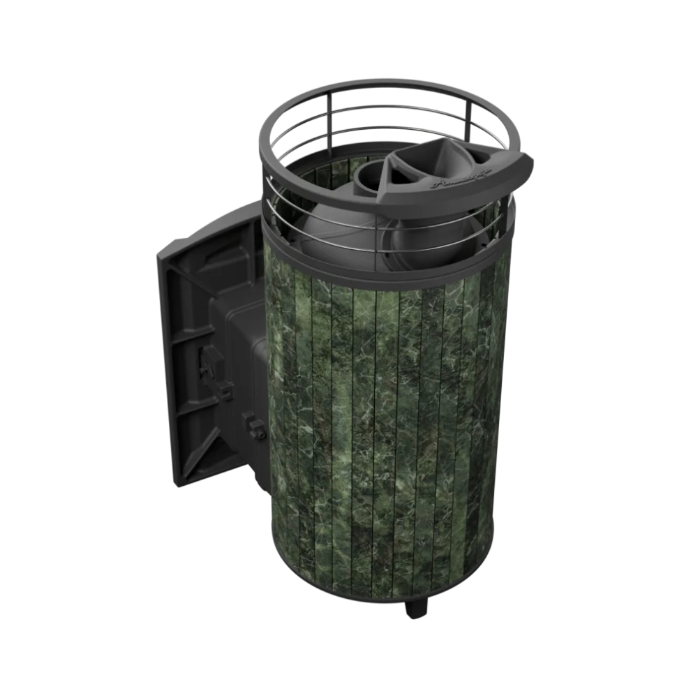 Практичная и компактная модель. Ламели из змеевика по периметру внешней каменки не только обладают хорошими теплонакопительными свойствами, но и придают печи оригинальный внешний вид