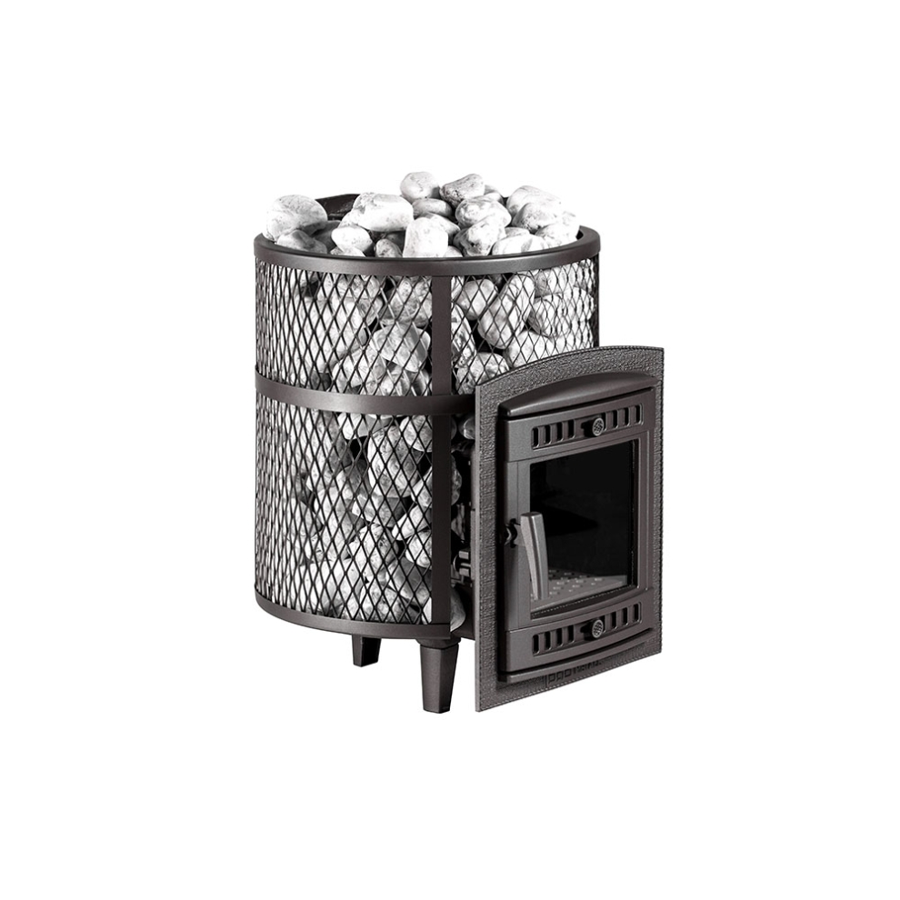 Ультра компактная модель банной печи с коротким топливным тоннелем. Кожух печи изготовлен в виде сетки из нержавеющей стали и полностью заполняется природными камнями, обеспечивая высокую динамику нагрева парильного помещения.