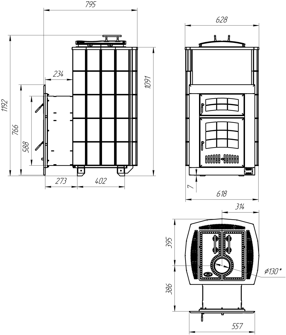 Дровяная печь «Чародейка М» («М» - мини) – уменьшенный вариант печи «Чародейка», предназначена для эксплуатации в парных помещениях объёмом до 20 м3. Топочный агрегат, как и у печи «Чародейка», выполнен из нержавеющей стали AISI 439 толщиной 4 мм, аналога стали 12Х18Н10Т из которой в соответствии с ГОСТом 5632-72 разрешается изготавливать детали печного оборудования и в версии PRO из аустенитной нержавеющей стали AISI 304.