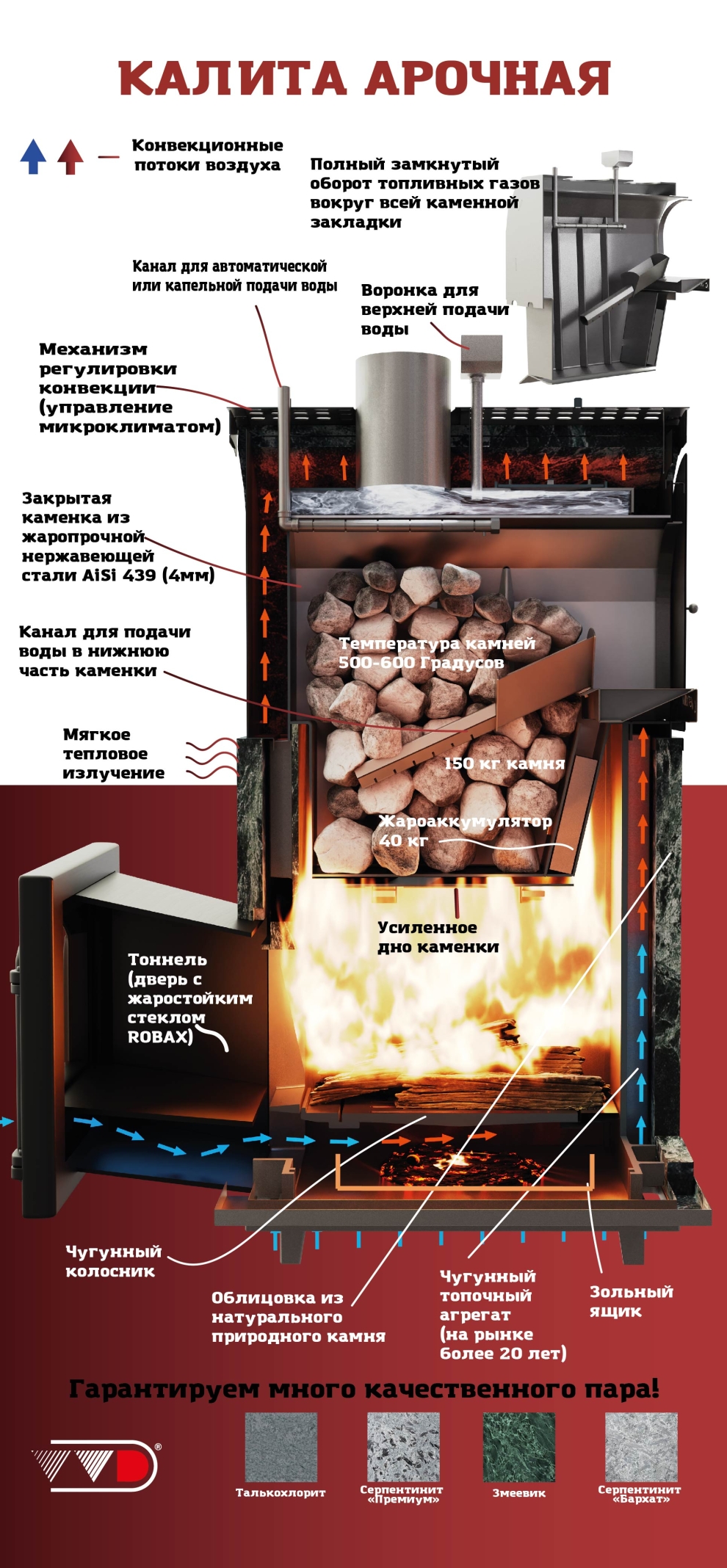 Печь «Калита Арочная Pro» способна достаточно быстро разогреть помещение. Через два-три часа печь наберет необходимое количество тепла, чтобы удерживать температуру в парилке в течении нескольких часов. Подождите, пока прогорят все дрова, и печь начнет излучать тепло, приятное и полезное для человеческого организма. Теперь процесс парения будет проходить самым лучшим образом!
