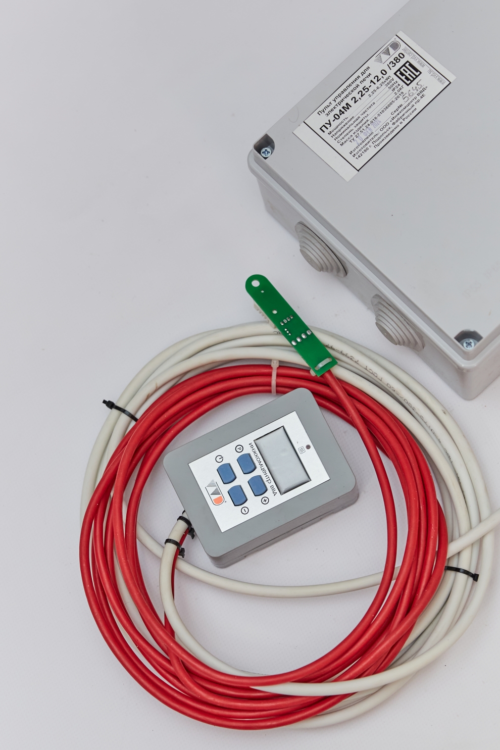 Пульт управления состоит из двух блоков: Блока Управления и Силового блока. Блок Управления представляет собой пластиковый корпус, на лицевой поверхности которого, размещены текстовый информационный экран и кнопки управления. Внутри Блока Управления размещены электронные компоненты, обеспечивающие алгоритм работы Устройства. Электронные компоненты Блока Управления смонтированы на печатной плате. Блок Управления оснащается датчиком температуры, расположенным вне Блока Управления и устанавливаемым внутри парильного помещения. Датчик температуры и влажности подключается к пульту управления собственным кабелем длиной 5 метров. Силовой Блок выполнен в виде металлического, электрического шкафа с пыле-влагозащитой IP 65. Внутри которого установлены автоматы защиты, коммутационные компоненты, шины и клеммы для подключения кабелей.