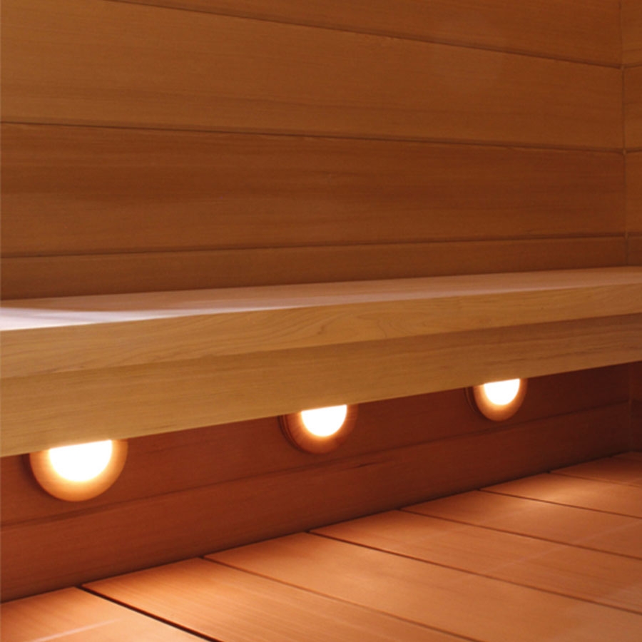 Круглый потолочный светильник для бани и сауны и ванной. Подключается к оптическому волокну или светодиодному кабелю. Изготовлен из матового стекла, алюминиевого отражателя и деревянной оправы. При желании, оправу можно обработать маслом для получения более темного тона.