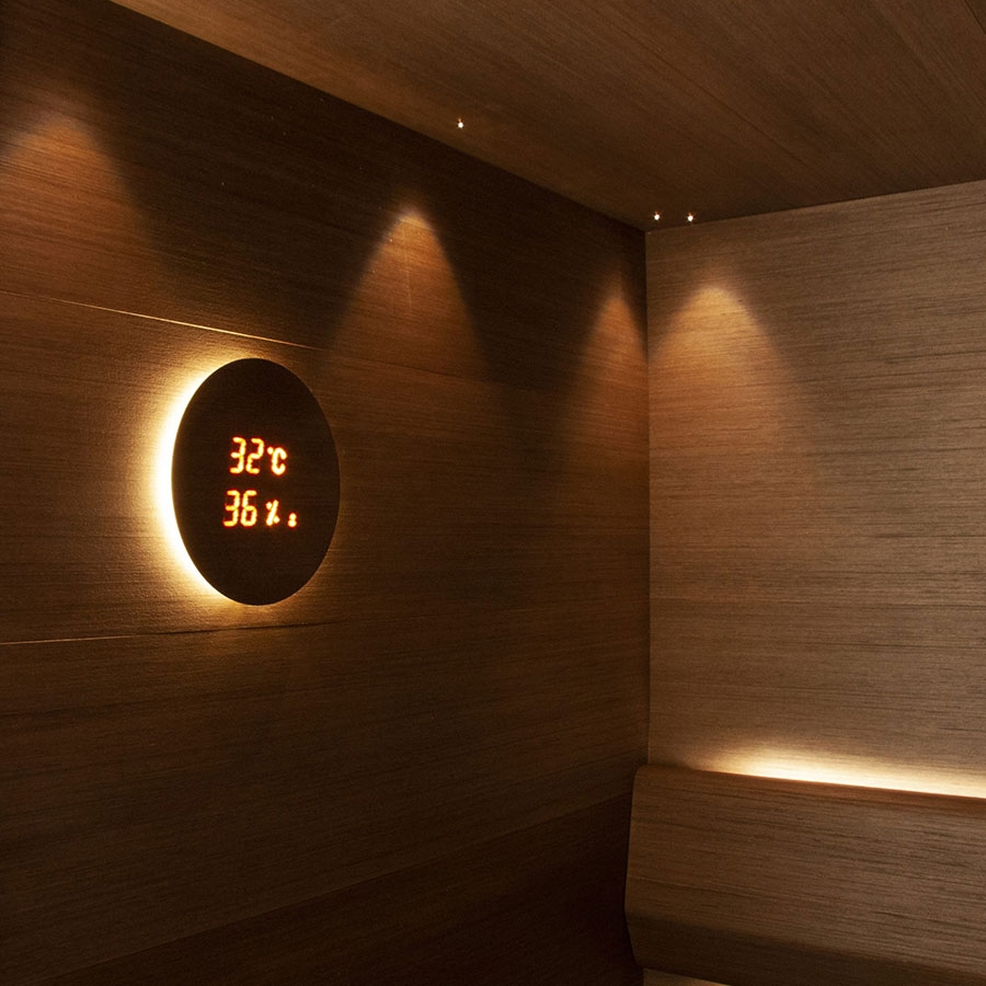 Термометр, гигрометр, таймер и осветительный прибор в одном корпусе. Размещается на стене в 30 см от потолка и не менее чем в 50 см от каменки.