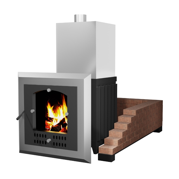 Топочный агрегат комплектуется каменкой с верхней загрузкой из жаропрочной коррозионностойкой стали AISI 430 оригинальной конструкции. Конструкция каменки такова, что за счет 100%-го охвата пламенем ее поверхности, прогрев камней осуществляется до высоких температур. Переменная высота съемного тоннеля для каменки позволяет Покупателю самостоятельно определять высоту кирпичной облицовки, изменяя тем самым тепловые характеристики печи и ее внешний вид. По желанию Покупателя топочный агрегат комплектуется «паровой пушкой» - приспособлением, позволяющим получать пар с камней, находящихся в нижней части каменки.